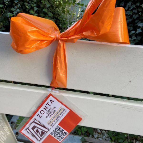 Während der UN-Kampagne „Orange the World“ vom 25.November bis 10.Dezember setzen wir durch das Anbringen orangefarbener Schleifen an öffentlichen Bänken, Bäumen und Brückengeländern ein sichtbare Zeichen gegen Gewalt an Frauen. Die Schleifen sind mit einem QR-Code zum bundes-weiten Hilfetelefon, den Frauenhäuser der Region und weiteren Hilfsangeboten versehen.